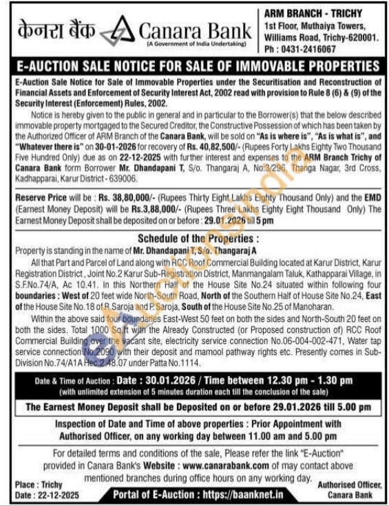 Schedule of the Properties: Property is standing in the name of Mr. Dhandapani T, S/o. Thangaraj A All that Part and Parcel of Land along with RCC Roof Commercial Building located at Karur District, Karur Registration District, Joint No.2 Karur Sub-Registration District, Manmangalam Taluk, Kathapparai Village, in S.F.No.74/A, Ac 10.41. In this Northern Half of the House Site No.24 situated within following four boundaries: West of 20 feet wide North-South Road, North of the Southern Half of House Site No.24, East of the House Site No. 18 of R.Saroja and P. Saroja, South of the House Site No.25 of Manoharan.