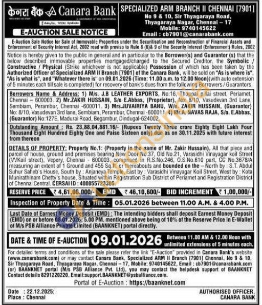 DETAILS OF PROPERTY: Property No.1: (Property in the name of Mr. Zakir Hussain), All that piece and parcel of house, ground and premises bearing New Door No.37, Old No.21, Varasidhi Vinayagar koil Street (VVKoil street), Vepery, Chennai 600003, comprised in R.S.No.246, 0.S.No.610 part, CC No.3678/A measuring an extent of 1 Ground and 455 Sq.ft. or thereabouts and bounded on the North by: S.T. Abdul Suhur Saheb's House, South by Anjaneya Temple, East by: Varasidhi Vinayagar Koil Street, West by Kota Munirathinam Chetty's house, Situated within Registration Sub District of Periamet and Registration District of Chennai Central CERSAI ID: 400055723305