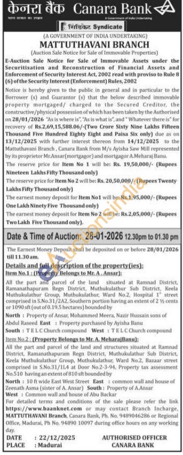 Details and full description of the property[ies):Item No.2: (Property Belongs to Mr. A. MeharajBanu): All the part and parcel of the land and structures situated at Ramnad District, Ramanathapuram Regn District, Muthukulathur Sub District, Keela Muthukulathur Group, Muthukulathur, Ward No.2, Bazaar street comprised in S.No.31/114 at Door No.2-3-94, Property tax assessment No.510 having an extent of 810 sft bounded by North 10 ft wide East West Street East common wall and house of Zeenath Asma (sister of A. Ansar) South: Property of A.Ansar West Common wall and house of Abu Backar