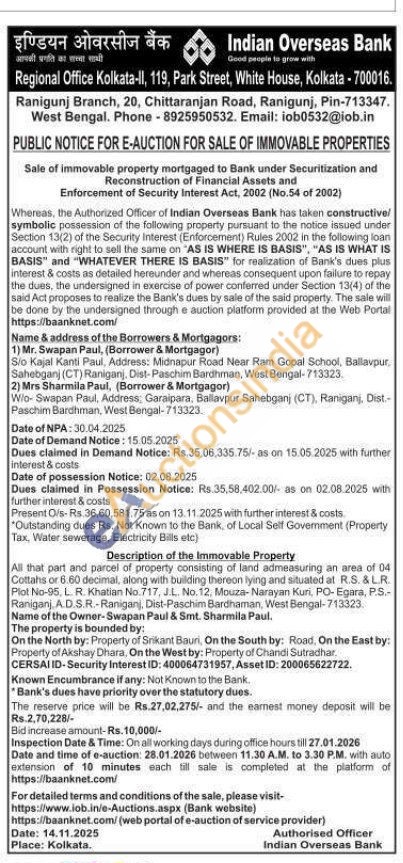 All that part and parcel of property consisting of land admeasuring an area of 04 Cottahs or 6.60 decimal, along with building thereon lying and situated at R.S. & L.R. Plot No-95, L. R. Khatian No.717, J.L. No. 12, Mouza-Narayan Kuri, PO- Egara, P.S.-Raniganj, A.D.S.R.-Raniganj, Dist-Paschim Bardhaman, West Bengal-713323.