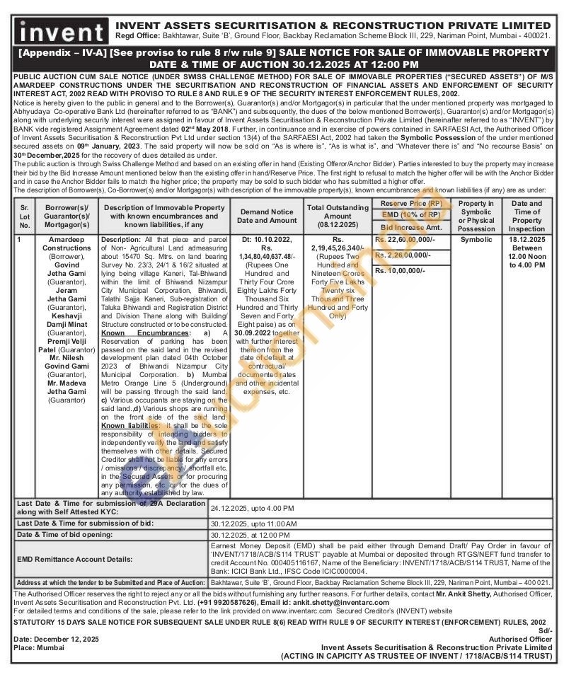 Description: All that piece and parcel of Non- Agricultural Land admeasuring about 15470 Sq. Mtrs, on land bearing Survey No. 23/3, 24/1 & 16/2 situated at lying being village Kaneri, Tal-Bhiwandi within the limit of Bhiwandi Nizampur City Municipal Corporation, Bhiwandi, Talathi Sajja Kaneri, Sub-registration of Taluka Bhiwandi and Registration District and Division Thane along with Building/Structure constructed or to be constructed. Known Encumbrances: a) A Reservation of parking has been passed on the said land in the revised development plan dated 04th October 2023 of Bhiwandi Nizampur City Municipal Corporation. b) Mumbai Metro Orange Line 5 (Underground) will be passing through the said land, c) Various occupants are staying on the said land. d) Various shops are running on the front side of the said land. Known liabilities: It shall be the sole responsibility of intending bidders to independently verify the land and satisfy themselves with other details. Secured Creditor shall not be liable for any errors. /omissions/discrepancy/shortfall etc. in the Secured Assets or for procuring any permission, etc. or for the dues of any authority established by law.