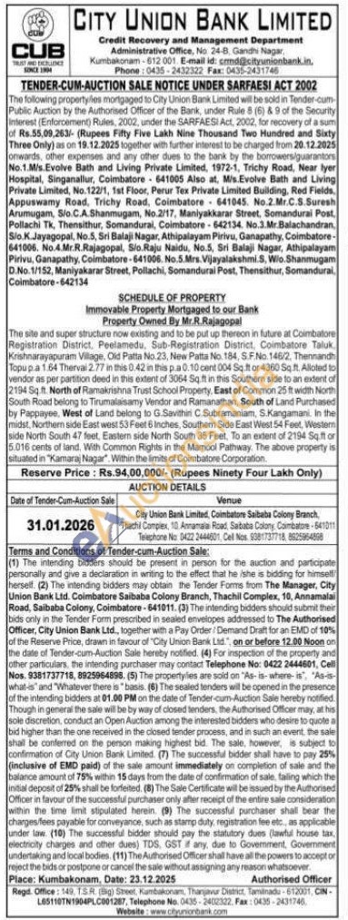 SCHEDULE OF PROPERTY : Immovable Property Mortgaged to our Bank Property Owned By Mr.R.Rajagopal The site and super structure now existing and to be put up thereon in future at Coimbatore Registration District, Peelamedu. Sub-Registration District, Coimbatore Taluk Krishnarayapuram Village, Old Patta No.23, New Patta No. 184, S.F.No. 146/2, Thennandh Topu pa 1.64 Thervai 2.77 in this 0.42 in this p.a 0.10 cent 004 Sq.ft or 4360 Sq ft. Alloted to vendor as per partition deed in this extent of 3064 Sq.ft in this Southern side to an extent of 2194 Sq.ft. North of Ramakrishna Trust School Property, East of Common 25 ft width North South Road belong to Tirumalaisamy Vendor and Ramanathan, South of Land Purchased by Pappayee, West of Land belong to G.Savithini C.Subramaniam, S.Kangamani. In the midst, Northern side East west 53 Feet 6 Inches, Southem Side East West 54 Feet, Western side North South 47 feet, Eastern side North South 35 Feet, To an extent of 2194 Sq.ft or 5.016 cents of land, With Common Rights in the Mamool Pathway. The above property is situated in "Kamaraj Nagar". Within the limits of Coimbatore Corporation