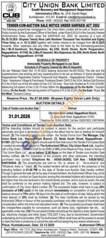 SCHEDULE OF PROPERTY : Immovable Property Mortgaged to our Bank Schedule A (Property Owned By Mrs.R.Vasanthi) : As per Release Deed Dtd: 01.04.2022 bearing document No.697/2022) The site and the superstructure now existing and any superstructure to be put up thereon in future situated at Nagapattinam Registration District-Tirupoondi Sub Registry - Nagapattinam District - Kilvelur Taluk-Velankanni Village & Panchayat-Pookkara Street-Old R.S.No.5/3A-Before Sub Division R.S.No.5/344 out of the full extent of Hec 0.07.50 Ares-Now Sub Divided as R.S.No.5/3A4B-Measuring full extent of Hec 0.06.75 Ares Within the Boundaries of On the North: Tsunami Colony, On the South: Remaining extent of Property in R.S.No.5/3A4, On the East: Road, On the West: Tsunami Colony