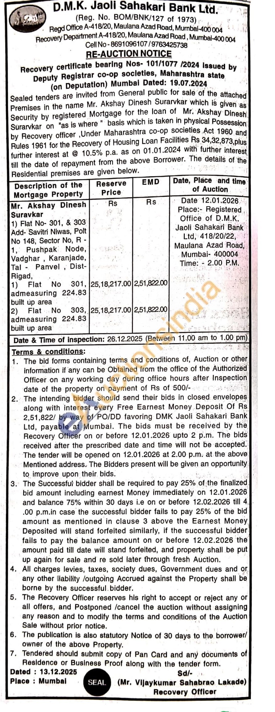 Flat No-301, & 303 Add-Savitri Niwas, Polt No 148, Sector No, R 1. Pushpak Node, Vadghar, Karanjade. Tal Panvel, Dist-Rigad, 2) Flat No 303, admeasuring 224.83 built up area