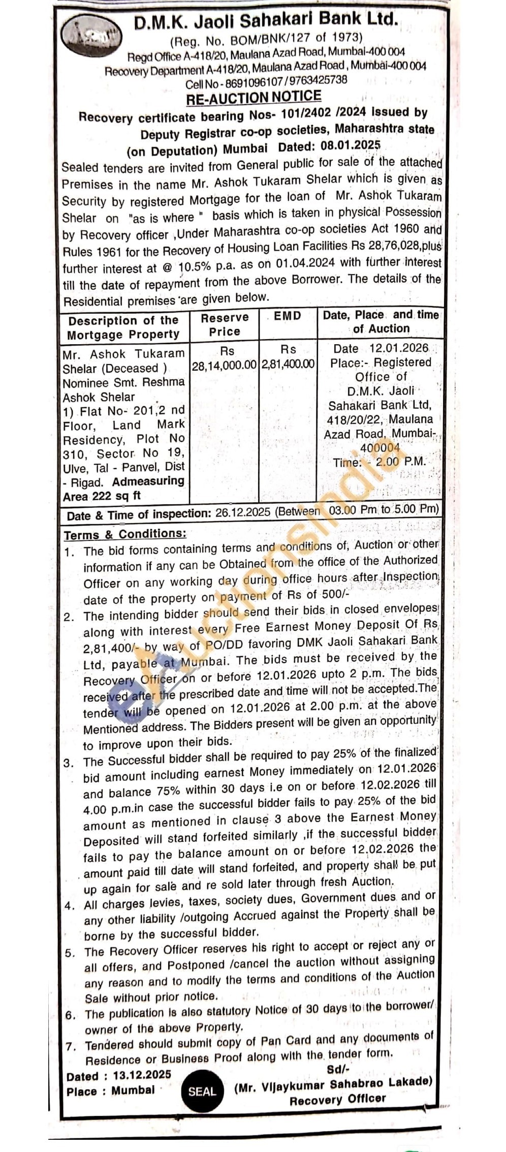 Flat No- 201,2 nd Floor, Land Mark Residency, Plot No 310, Sector No 19. Ulve, Tal Panvel, Dist -Rigad. Admeasuring Area 222 sq ft