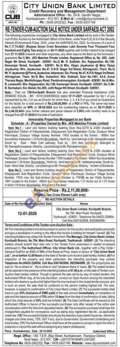 Item No.1: Land and factory building bearing Door Nos.2/279 & 2/280 situated at Registration District of Palayamkottai, Ettayapuram Sub-Registration Circle, Duraiyur Minor Panchayat, Duraiyur Village Survey Number 176/5 located to the Extent: Within four boundaries measures 1.33 Acres Boundaries: North by: land belongs to Mr. Ganapathynadar South by East West Cart pathway, East by 2nd item (previously belonged to Mr. Ramaiahmoopanar, West by: Land belongs to Mr. Ramaiahmoopar.