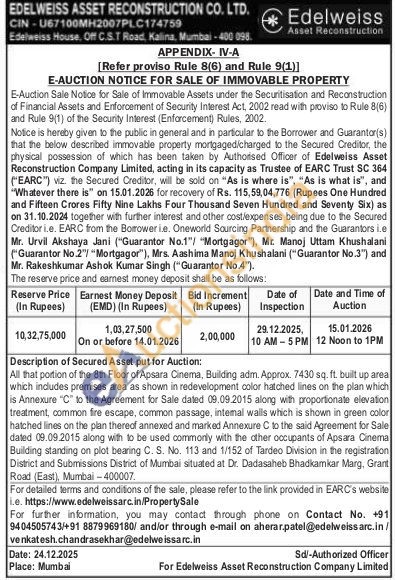Description of Secured Asset put for Auction: All that portion of the 8th Floor of Apsara Cinema, Building adm. Approx. 7430 sq. ft. built up area which includes premises area as shown in redevelopment color hatched lines on the plan which is Annexure "C" to the Agreement for Sale dated 09.09.2015 along with proportionate elevation treatment, common fire escape, common passage, intemal walls which is shown in green color hatched lines on the plan thereof annexed and marked Annexure C to the said Agreement for Sale dated 09.09.2015 along with to be used commonly with the other occupants of Apsara Cinema Building standing on plot bearing C. S. No. 113 and 1/152 of Tardeo Division in the registration District and Submissions District of Mumbai situated at Dr. Dadasaheb Bhadkamkar Marg, Grant Road (East), Mumbai -400007
