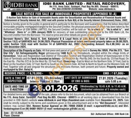 Description of the Property on Sale: All that piece and parcel of Land comprised in Survey No. 189/6, Plot No.373, "Sun Star City", Sri Selvaganapathy Nagar admeasuring 1480 Sq.ft., or thereabouts, situated within the village limits of Kaivandoor, Taluk and Registration Sub District of Thiruvallur, District and Registration District of Kancheepuram in the State of Tamilnadu and the land is bounded as follows:- On the North By: Plot No.340; On the South By: 23 Feet Road; On the East By: Plot No.372 & On the West By: 23 Feet Road, Measuring:-East to West on the Northern Side: 37 Feet, East to West on the Southern Side: 37 Feet, North to South on the Eastern Side: 40 Feet & North to South on the Western Side: 40 Feet, Together with all and singular the structures and erections thereon, both present and future. Property owned and mortgaged by Shri. Balaji K