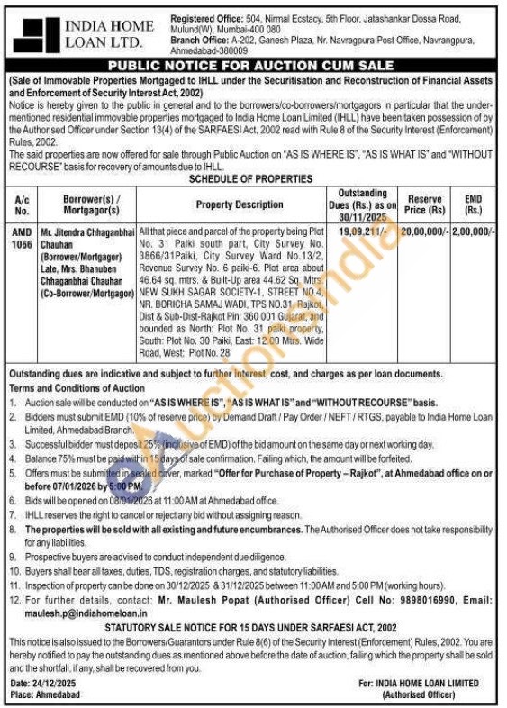 All that piece and parcel of the property being Plot No. 31 Paiki south part, City Survey No. 3866/31Paiki, City Survey Ward No.13/2, Revenue Survey No. 6 paiki-6. Plot area about 46.64 sq. mirs. & Built-Up area 44.62 Sq. Mrs. NEW SUKH SAGAR SOCIETY-1, STREET NO.4. NR. BORICHA SAMAJ WADI, TPS NO.31, Rajkot, Dist & Sub-Dist-Rajkot Pin: 360 001 Gujarat, and bounded as North: Plot No. 31 paiki property, South Plot No. 30 Paiki, East: 12.00 Mtrs. Wide Road, West: Plot No. 28