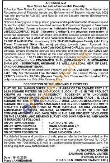 DESCRIPTION OF THE IMMOVABLE PROPERTY : FLAT NO. 204, HAVING SUPER BUILT-UP AREA OF 720 SQUARE FEET LE. 66.88 SQUARE METERS ON 2ND FLOOR, BLOCK-27-E, IN THE PROJECT KNOWN AS "AAGAM 99 RESIDENCY, TOGETHER WITH UNDIVIDED PROPORTIONATE SHARE ADMEASURING 45.72 SQUARE YARDS I. E. 38.23 SQUARE METERS IN THE NON AGRICULTURAL LAND ADMEASURING 9819 SQUARE METERS, BEARING AMALGAMATED REVENUE SURVEY NO. 949 P2 SITUATED, LYING AND BEING AT MOJE SACHANA, TALUKA VIRAMGAM, AHMEDABAD 382110, GUJARAT, ALONGWITH RIGHTS TO USE THE COMMON AMENITIES AND FACILITIES IN THE SAID PROJECT DEVELOPED ON THE LARGER LAND BEARING SURVEY NOS. 949/1 AND 949/2, AND WHICH IS BOUNDED AS FOLLOWS:-