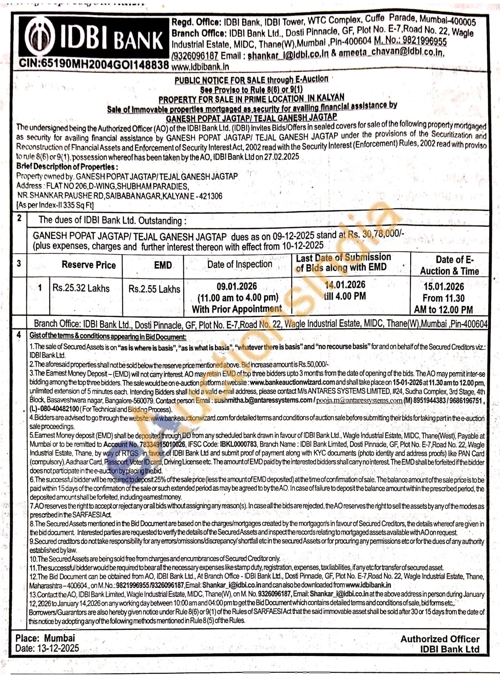 Brief Description of Properties: Property owned by, GANESH POPAT JAGTAP/TEJAL GANESH JAGTAP Address: FLAT NO 206,D-WING, SHUBHAM PARADIES, NR. SHANKAR PAUSHE RD, SAIBABANAGAR, KALYANE-421306 [As per Index-11 335 Sq Ft