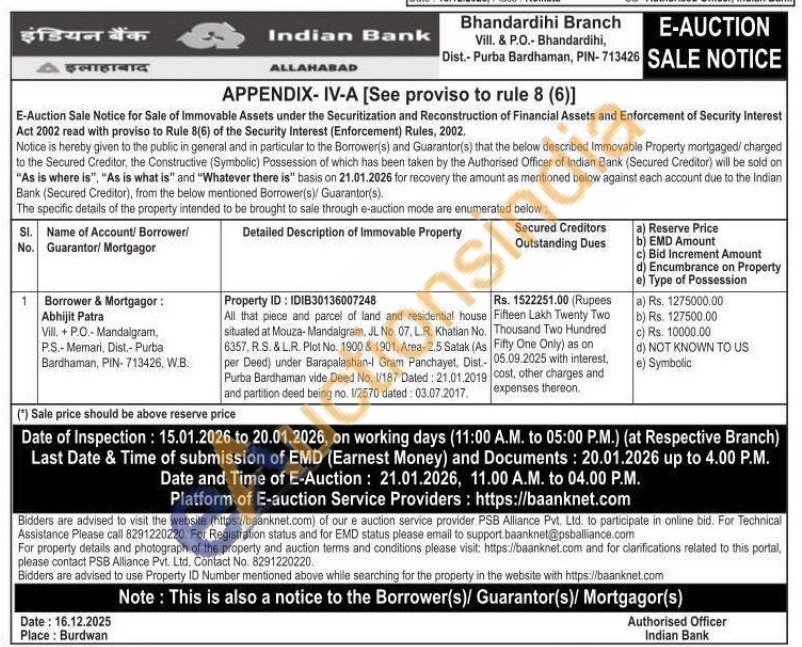 All that piece and parcel of land and residential house situated at Mouza-Mandalgram, JL No. 07, L.R. Khatian No. 6357, R.S. & L.R. Plot No. 1900 & 1901, Area-2.5 Satak (As per Deed) under Barapalashan-1 Gram Panchayet, Dist.-Purba Bardhaman vide Deed No. 1/187 Dated: 21.01.2019 and partition deed being no. 1/2570 dated: 03.07.2017