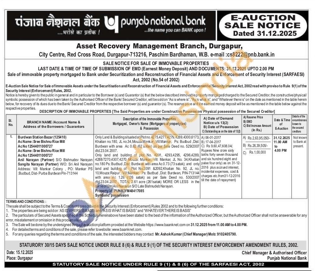 Only Land & Building situated at Plotno.4275,4277,4279,4269,4300,6173, Khatian no. 180, JL no.34, Mouza Mankar Vill: Mankar, Ps: Budbud, Dist: Burdwan with area Ac 0.62 (62 satak) as per Sale Deed no. 529/2007 dtd.23.04.2007. Only land and building of plot No. 4291, 4293,4295, 4296,4289, 4288/7270,4307,4270 Mouza: Mankar, Vill: Mankar, JL No. 34, Khatian no. 180 Ps: Budbud, Dist: Burdwan with area Ac 0.73 (73 satak); and only land and building of Plot No.2091 &2092, Khatian No. 92, JL no. 10, Mouza: Raipur, Vill: Mankar, Ps: Budbud, Dist: Burdwan, PIN-713144 with area Ac 1.26 (126 satak) as per Sale Deed no. 530/2007 dtd.23.04.2007, TOTAL 2.61 acre (261satak) MORE OR LESS in the name of Shri Anil Narayan S/O Late Bishnudeb Narayan