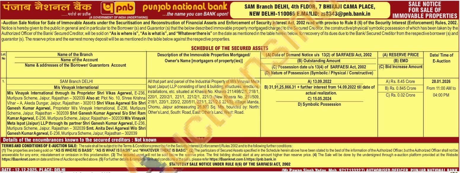 All that part and parcel of the Industrial Property of Mis Vinayak Meta Ispat (Jaipur) LLP consisting of land & building, structures, erections, installations, etc. situated at Khasra No. Khasra 211/498/2/1, 218/1, 220/1, 220/2/1, 221/1, 221/2/1, 221/3 (New Khasra No. 211/509, 218/1, 220/1, 220/2, 220/511, 221/1, 221/2 & 221/3), Village Manda, Chomu, Jaipur admeasuring 26,800 Sq. Mts. bounded by: North: Other's Land, South: Road, East Other's Land, West: Road.