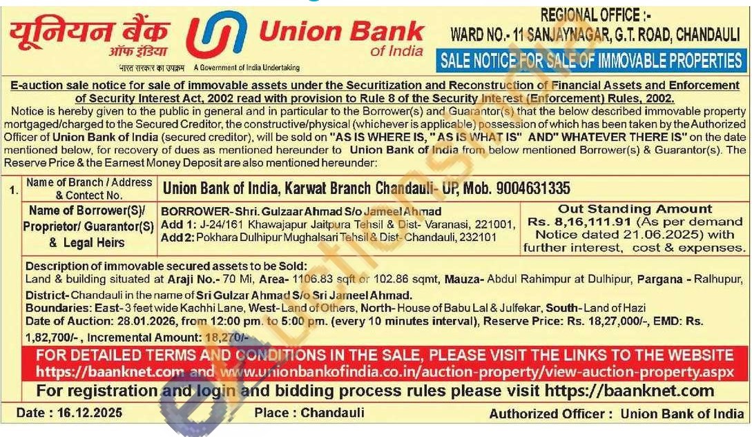 Description of immovable secured assets to be Sold: Land & building situated at Araji No.- 70 Mi, Area-1106.83 sqft or 102.86 sqmt, Mauza- Abdul Rahimpur at Dulhipur, Pargana - Ralhupur, District-Chandauli in the name of Sri Gulzar Ahmad S/o Sri Jameel Ahmad. Boundaries: East-3 feet wide Kachhi Lane, West-Land of Others, North-House of Babu Lal & Julfekar, South-Land of Hazi
