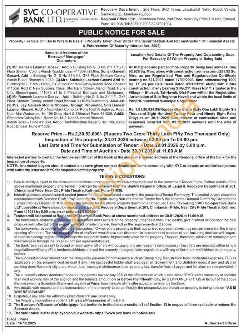 All that piece and parcel of the property being land admeasuring 92.928 Sq. Mtrs. along with construction admeasuring 251.92 Sq. Mtrs, as per Regularised Plan and Regularisation Certificate - bearing no.721/2003 dated 17/09/2003, land admeasuring 1000 Sq. Ft. as per Sale Deed dated 09/12/1996 along with future construction, if any bearing S.No.211 Hissa No1/1 situated in the Village Bhosari, Tal-Haveli, Dist-Pune within the Registration Jurisdiction of Sub Registrar Haveli and within the local limits of Pimpri Chinchwad Municipal Corporation.