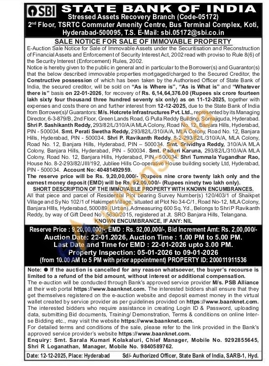 All that piece and parcel of Residential Plot bearing Survey Number(s) 120/403/1 of Shaikpet Village and Sy No 102/1 of Hakimpet Village, situated at Plot No 34-C/1, Road No-12. MLA Colony, Banjara HIIIs, Hyderabad, 500089, (Urban), Admeasuring 600 Sq. Yd., Belongs to Shri P Ravikanth Reddy, by way of Gift Deed No: 5630/2015, registered at Jt. SRO Banjara Hills, Telangana.