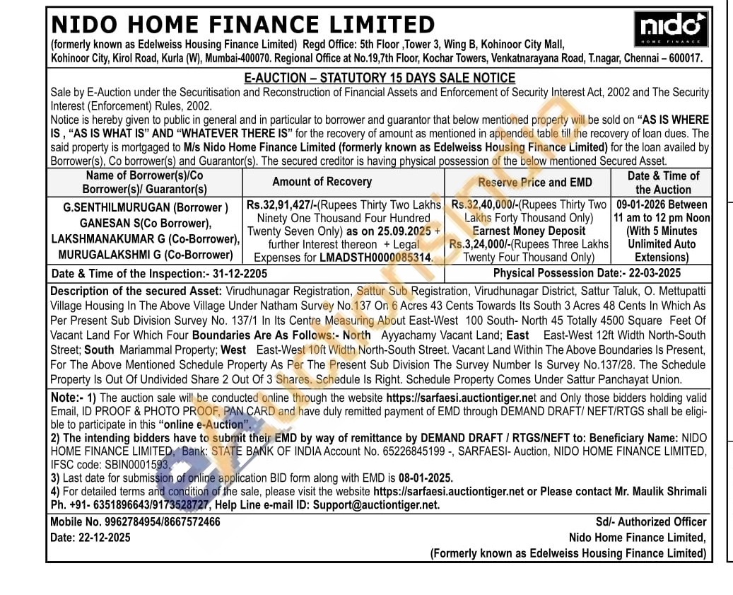 Description of the secured Asset: Virudhunagar Registration, Sattur Sub Registration, Virudhunagar District, Sattur Taluk, O. Mettupatti Village Housing In The Above Village Under Natham Survey No.137 On 6 Acres 43 Cents Towards Its South 3 Acres 48 Cents In Which As Per Present Sub Division Survey No. 137/1 In Its Centre Measuring About East-West 100 South- North 45 Totally 4500 Square Feet Of Vacant Land For Which Four Boundaries Are As Follows:- North Ayyachamy Vacant Land; East East-West 12ft Width North-South Street; South Mariammal Property; West East-West 10ft Width North-South Street. Vacant Land Within The Above Boundaries Is Present, For The Above Mentioned Schedule Property As Per The Present Sub Division The Survey Number Is Survey No. 137/28. The Schedule Property Is Out Of Undivided Share 2 Out Of 3 Shares. Schedule Is Right. Schedule Property Comes Under Sattur Panchayat Union.