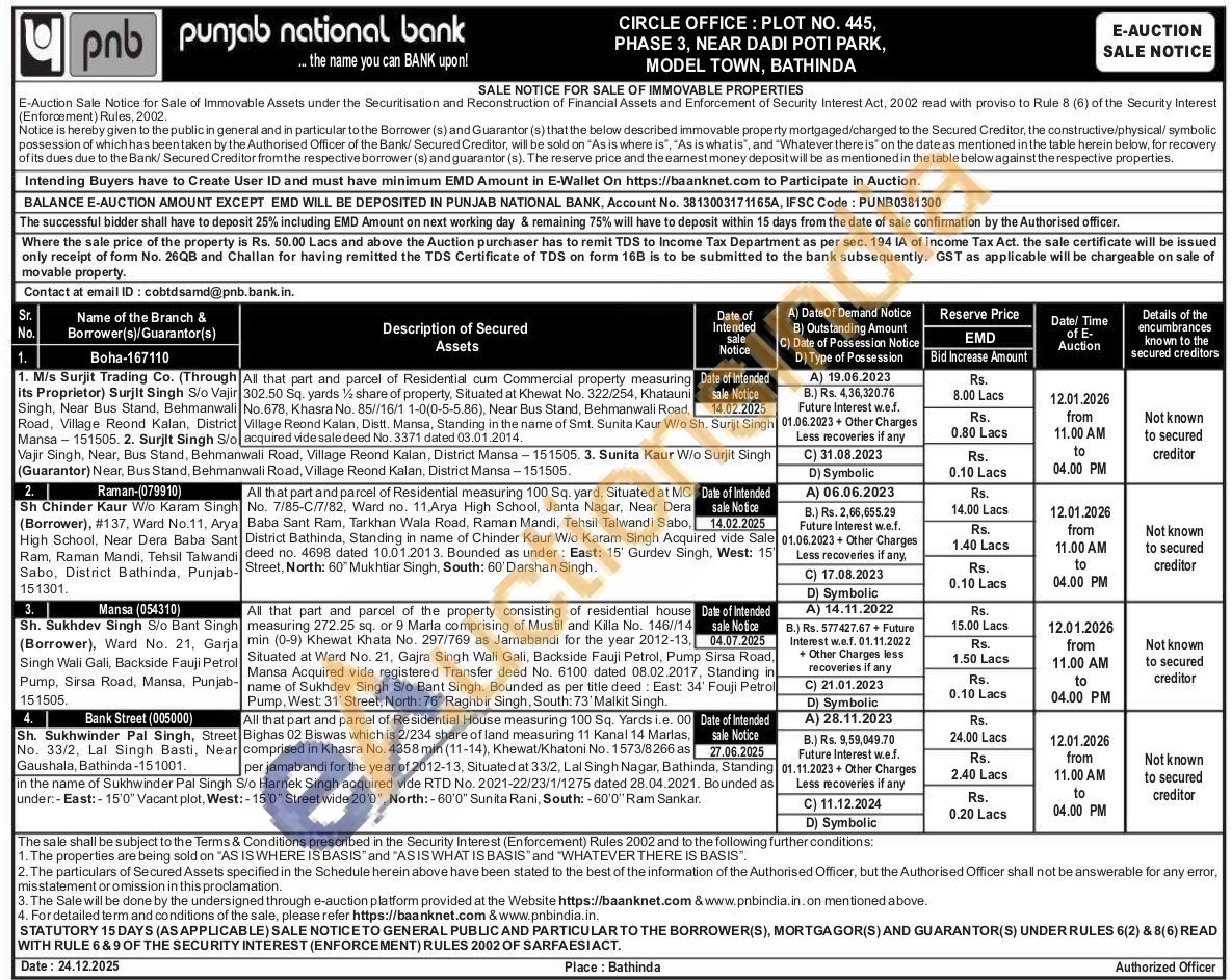 All that part and parcel of Residential measuring 100 Sq. yard, Situated at MCNo. 7/85-C/7/82, Ward no. 11, Arya High School, Janta Nagar, Near Dera Baba Sant Ram, Tarkhan Wala Road, Raman Mandi, Tehsil Talwandi Sabo, District Bathinda, Standing in name of Chinder Kaur W/o Karam Singh Acquired vide Sale deed no. 4698 dated 10.01.2013. Bounded as under: East: 15' Gurdev Singh, West: 15' Street, North: 60" Mukhtiar Singh, South: 60' Darshan Singh