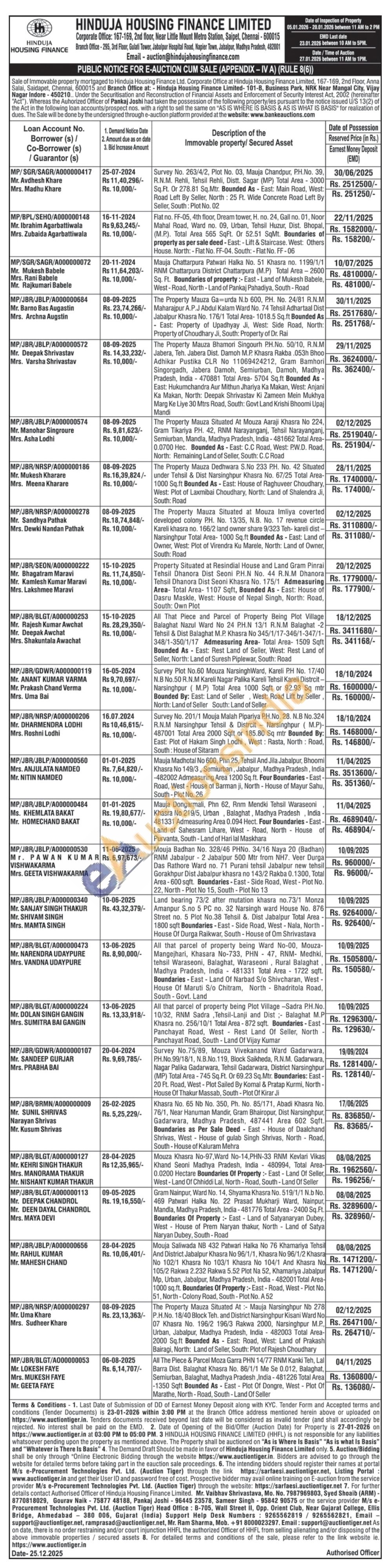 contact Authorised Officer of Hinduja Housing Finance Limited. Mr. Vaibhav Shrivastava, Mo. No. 7987969803, Syed Shoaib (ARM) -8770818029, Gourav Naik-75877 48188, Pankaj Joshi - 96445 23578, Sameer Singh - 95842 90575