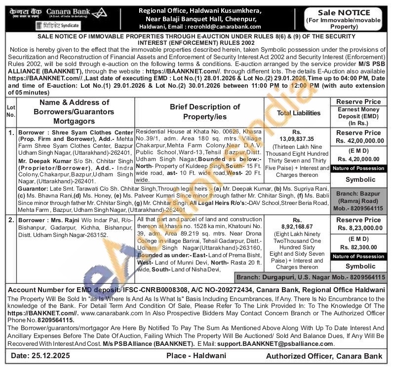 All that part and parcel of land and construction thereon at khasra no. 1528 ka min, Khatouni No. 39, adm. Area 89.219 sq. mtrs. Near Drona College in village Barirai, Tehsil Gadarpur, Distt.-Udham Singh Nagar (Uttarakhand)-263160, Bounded as under.-East-Land of Prema Bisht, West- Land of Munni Devi, North- Rasta 20 ft. wide, South-Land of Nisha Devi,