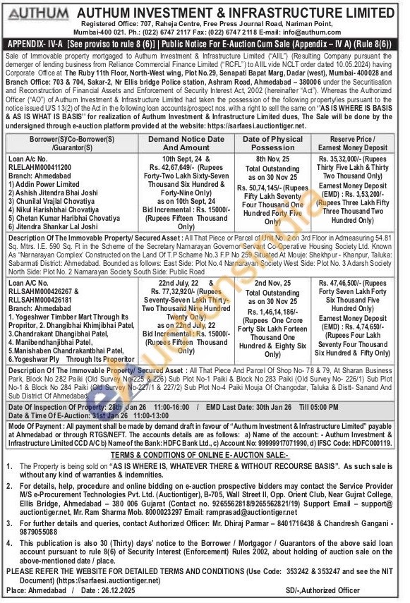 Description Of The Immovable Property/Secured Asset: All That Piece or Parcel of Unit No. 2 on 3rd Floor in Admeasuring 54.81 Sq. Mtrs. I.E. 590 Sq. Ft in the Scheme of the Secretary Narnarayan Govermor Servant Co-Operative Housing Society Ltd. Known As "Narnarayan Complex Constructed on the Land Of T.P Schame No.3 F.P No 259 Situated At Mouje: Shekhpur-Khanpur, Taluka: Sabarmati District: Ahmedabad. Bounded as follows: East Side: Plot No.4 Narnarayan Society West Side: Plot No. 3 Adarsh Society North Side: Plot No. 2 Namarayan Society South Side: Public Road
