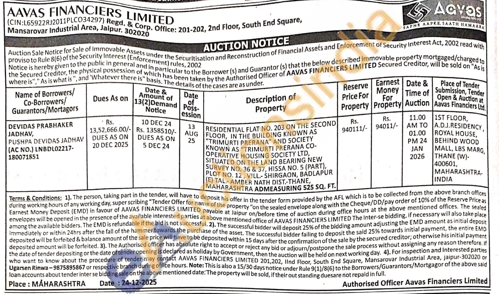 RESIDENTIAL FLATILDING KNOWN AS "TRIMURTI PRERANA" AND SOCIETY KNOWN AS "TRIMURTI PRERANA CO-OPERATIVE HOUSING SOCIETY LTD, SITUATED ON THE LAND BEARING NEW SURVEY NO. 36 & 37, HISSA NO. 5 (PART), PLOT NO. 12, VILL SHIRGAON, BADLAPUR (E) TAL.- AMBER NATH DIST.-THANE, MAHARASHTRA ADMEASURING 525 SQ. FT
