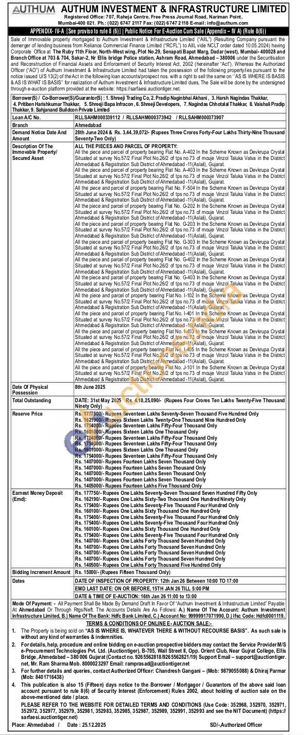 All the piece and parcel of property bearing Flat No. I-401 In the Scheme Known as Devkrupa Crystal Situated at survey No.57/2 Final Plot No.26/2 of tps no.73 of mouje Vinzol Taluka Vatva in the District Ahmedabad & Registration Sub District of Ahmedabad-11(Aslali), Gujarat.