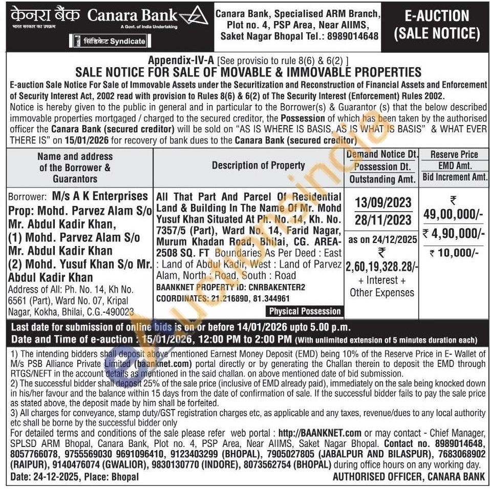 All That Part And Parcel Of Residential Land & Building In The Name Of Mr. Mohd Yusuf Khan Situated At Ph. No. 14, Kh. No. 7357/5 (Part), Ward No. 14, Farid Nagar, Murum Khadan Road, Bhilai, CG. AREA 2508 SQ. FT Boundaries As Per Deed: East .: Land of Abdul Kadir, West: Land of Parvez Alam, North: Road, South: Road
