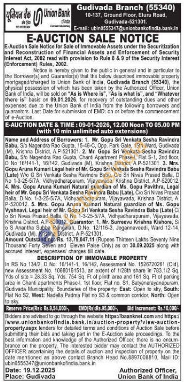 DESCRIPTION OF IMMOVABLE PROPERTY : In RS No 134/2, D No: 16/141-1, 16/142, Assessment No. 1526720261 (Old), new Assessment No. 10680161513, an extent of 1/28th share in 783.1/2 Sq. Yds of site 28.33 Sq. Yds. 754 Sq Ft of plinth area and 161 Sq. Ft of parking area in Chanti apartments Phase-l, 1st floor, Flat no. S1, Satyanarayanapuram, Gudivada Municipality. Boundaries of the property: East: Open to sky, South: Flat No S2. West: Nadella Padma Flat no S3 & common corridor, North: Open to sky