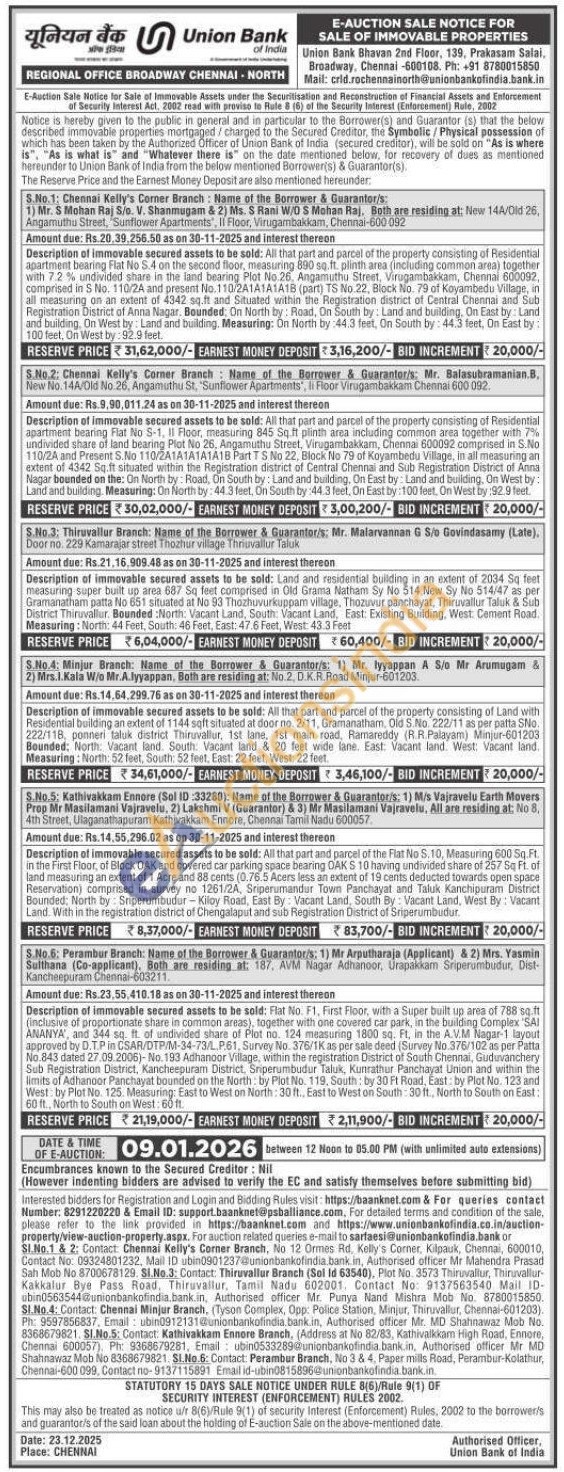 Description of immovable secured assets to be sold: All that part and parcel of the Flat No S. 10, Measuring 600 Sq.Ft. in the First Floor, of Block OAK and covered car parking space bearing OAK S 10 having undivided share of 257 Sq Ft. of land measuring an extent of 1 Acre and 88 cents (0.76.5 Acers less an extent of 19 cents deducted towards open space Reservation) comprised in survey no 1261/2A, Sriperumandur Town Panchayat and Taluk Kanchipuram District Bounded: North by Sriperumbudur-Kiloy Road, East By: Vacant Land, South By: Vacant Land, West By: Vacant Land. With in the registration district of Chengalaput and sub Registration District of Sriperumbudur