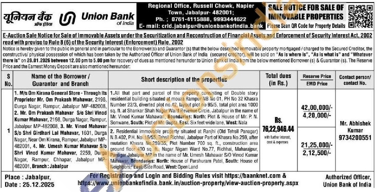 2. Residential immovable property situated at Ranjhi (Old Tehsil Panagar) N.B.402, P.H. No. 16/55, Tehsil Richhai, Jabalpur Part of Khasra No.259, after mutation Khasra No.259/35, Plot Number 700 sq. ft., construction area. ground floor 400 sq. ft., Nagar Nigam Ward No.77, Richhai, Maharajpur, Panagar Jabalpur MP in the name of Mr. Umesh Mahawar S/O Vinod Kumar Mahawar, Boundaries: North: House of Parshuram Patel, South: House of Neighbors, East: Side Road, West: Open Land