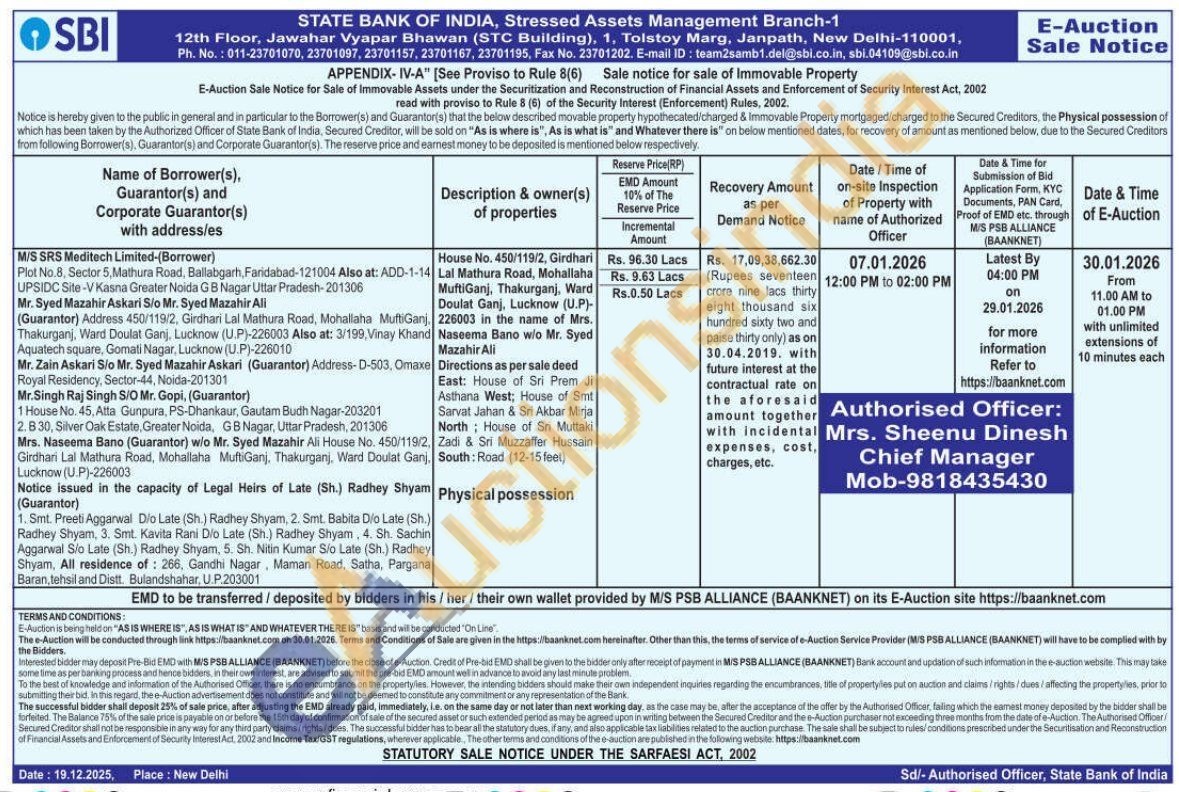 House No. 450/119/2, Girdhari Lal Mathura Road, Mohallaha MuftiGanj, Thakurganj, Ward Doulat Ganj, Lucknow (U.P)-226003 in the name of Mrs. Naseema Bano w/o Mr. Syed Mazahir AliSarvat Jahan & Sri Akbar Mirja North House of Sri Muttaki Zadi & Sri Muzzaffer Hussain Directions as per sale deed East: House of Sri Prem Ji Asthana West; House of Smt South: Road (12-15 feet)