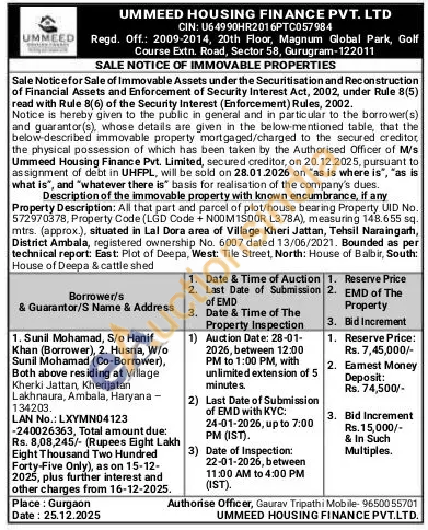 Property Description: All that part and parcel of plot/house bearing Property UID No. 572970378, Property Code (LGD Code + N00M1500R L378A), measuring 148.655 sq. mtrs. (approx.), situated in Lal Dora area of Village Kheri Jattan, Tehsil Naraingarh, District Ambala, registered ownership No. 6007 dated 13/06/2021. Bounded as per technical report: East: Plot of Deepa, West: Tile Street, North: House of Balbir, South: House of Deepa & cattle shed