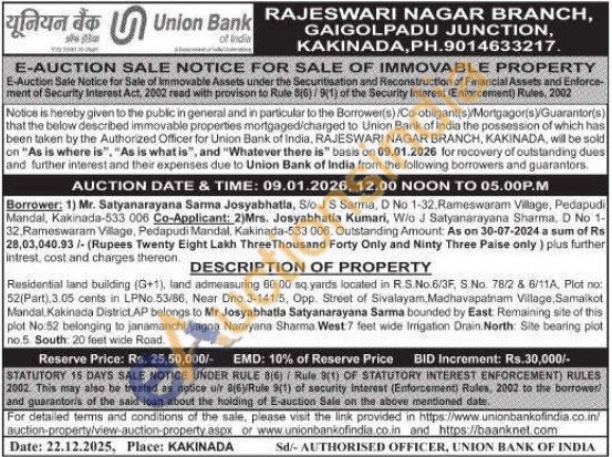 DESCRIPTION OF PROPERTY : Residential land building (G+1), land admeasuring 60.00 sq yards located in R.S.No.6/3F, S.No. 78/2 & 6/11A, Plot no: 52(Part).3.05 cents in LPNo 53/86, Near Dno.3-141/5, Opp. Street of Sivalayam. Madhavapatnam Village, Samalkot Mandal, Kakinada District AP belongs to Mr Josyabhatla Satyanarayana Sarma bounded by East Remaining site of this plot No 52 belonging to janamanchi yagna Narayana Sharma West 7 feet wide Irrigation Drain North Site bearing plot no.5 South: 20 feet wide Road