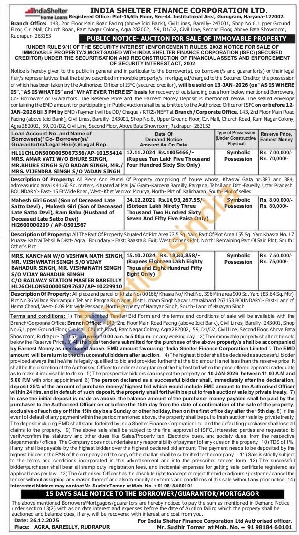 Description Of Property: All Piece And Parcel Of Property comprising of house whose, Khasra/ Gata no.383 and 384, admeasuring area is 41.60 Sq. meters, situated at Mauja/ Gram-Kargena Bareilly, Pargana, Tehsil and Ditt-Bareilly, Uttar Pradesh. BOUNDARY:- East-15 Ft Wide Road, West-Khet Vedram Mourya, North- Plot of Kalicharan, South- Plot of seller.