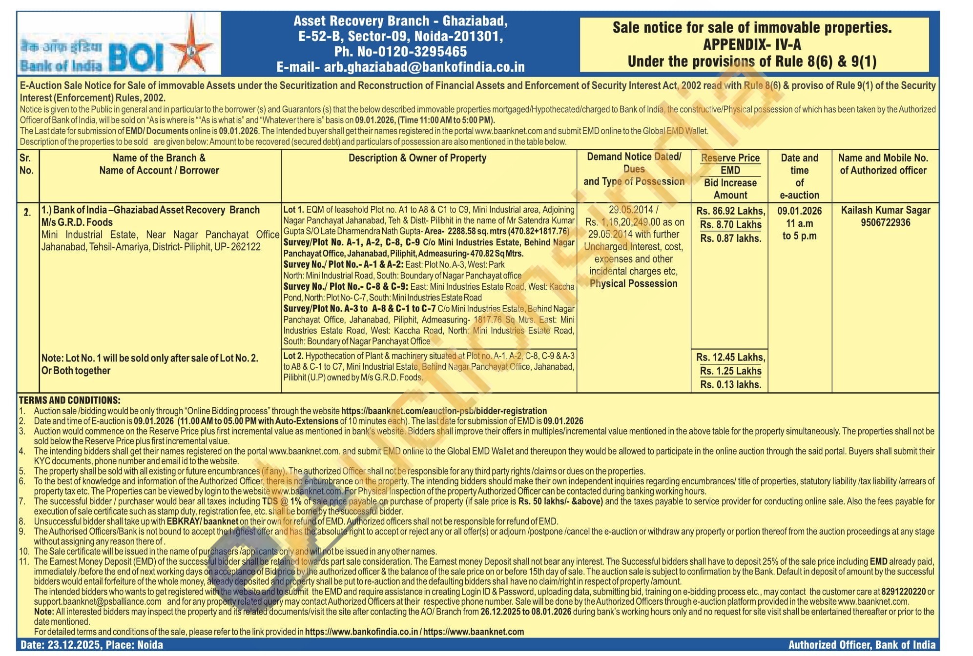 Lot 2. Hypothecation of Plant & machinery situated at Plot no. A-1. A-2, C-8, C-9&A-3 to A8 & C-1 to C7. Mini Industrial Estate, Behind Nagar Panchayat Office, Jahanabad Pilibhit (U.P) owned by Mis G.R.D. Foods
