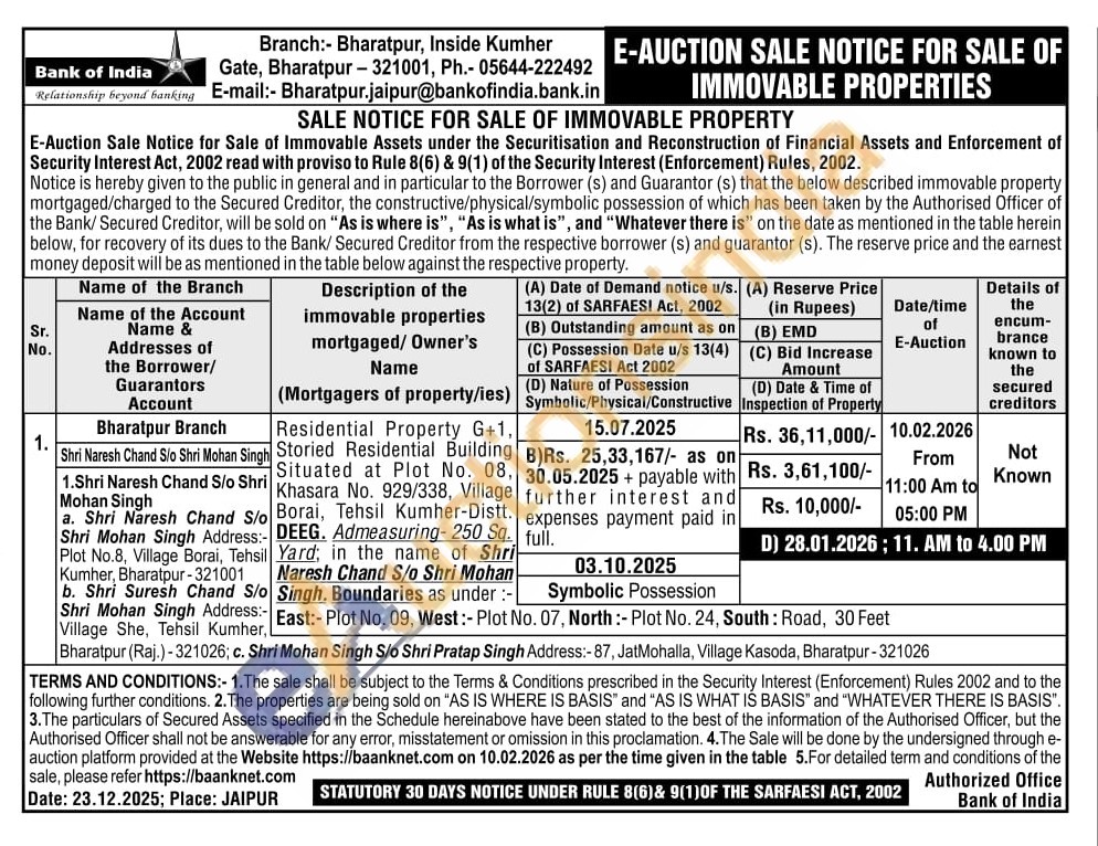 Residential Property G+1, Storied Residential Building Situated at Plot No. 08. Khasara No. 929/338, Village Borai, Tehsil Kumher-Distt. DEEG. Admeasuring-250 Sq. Yard; in the name of Shri Naresh Chand S/o Shri Mohan Singh. Boundaries as under :-East:- Plot No. 09, West :- Plot No. 07, North :- Plot No. 24, South: Road, 30 Feet