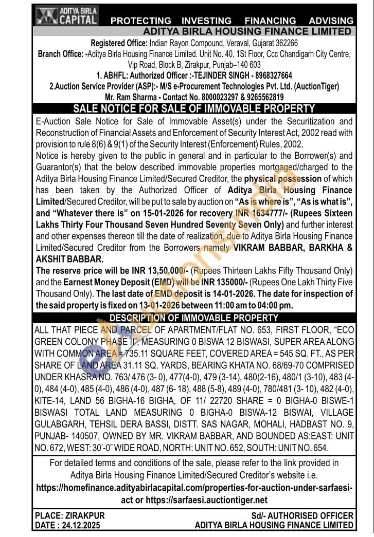 ALL THAT PIECE AND PARCEL OF APARTMENT/FLAT NO. 653, FIRST FLOOR, "ECO GREEN COLONY PHASE II", MEASURING 0 BISWA 12 BISWASI, SUPER AREA ALONG WITH COMMON AREA = 735.11 SQUARE FEET, COVERED AREA = 545 SQ. FT., AS PER SHARE OF LAND AREA 31.11 SQ. YARDS, BEARING KHATA NO. 68/69-70 COMPRISED UNDER KHASRA NO. 763/476 (3-0), 477(4-0), 479 (3-14), 480(2-16), 480/1 (3-10), 483 (4-0), 484 (4-0), 485 (4-0), 486 (4-0), 487 (6-18), 488 (5-8), 489 (4-0), 780/481 (3-10), 482 (4-0), KITE-14, LAND 56 BIGHA-16 BIGHA, OF 11/22720 SHARE 0 BIGHA-0 BISWE-1 BISWASI TOTAL LAND MEASURING 0 BIGHA-0 BISWA-12 BISWAI, VILLAGE GULABGARH, TEHSIL DERA BASSI, DISTT. SAS NAGAR, MOHALI, HADBAST NO. 9, PUNJAB-140507, OWNED BY MR. VIKRAM BABBAR, AND BOUNDED AS:EAST: UNIT NO. 672, WEST: 30'-0" WIDE ROAD, NORTH: UNIT NO. 652, SOUTH: UNIT NO. 654.