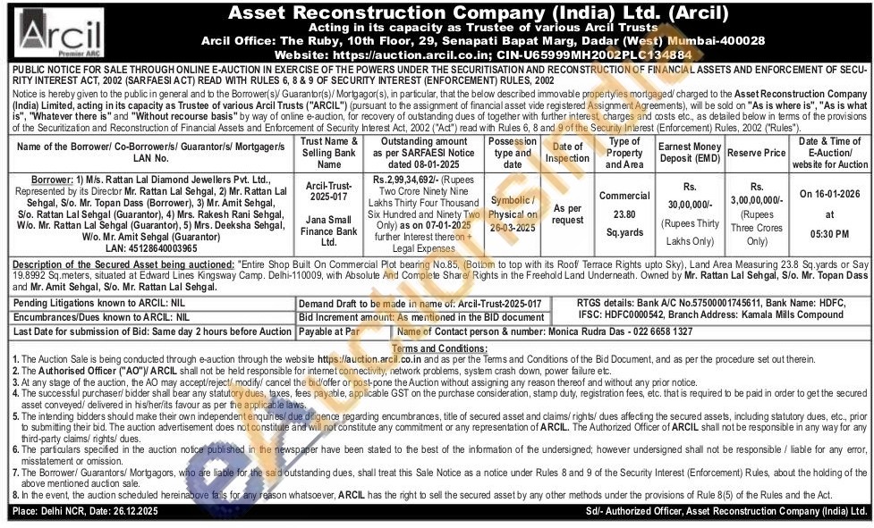 Description of the Secured Asset being auctioned: "Entire Shop Built On Commercial Plot bearing No.85, (Bottom to top with its Roof Terrace Rights upto Sky), Land Area Measuring 23.8 Sq.yards or Say 19.8992 Sq.meters, situated at Edward Lines Kingsway Camp. Delhi-110009, with Absolute And Complete Share/ Rights in the Freehold Land Underneath. Owned by Mr. Rattan Lal Sehgal, S/o. Mr. Topan Dass and Mr. Amit Sehgal, S/o. Mr. Rattan Lal Sehgal.