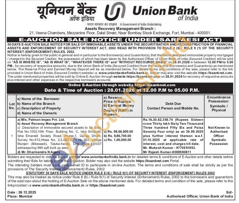 Description of immovable secured assets to be Sold: Flat No.1002,10th Floor, Building No. C. Isha Emarald, Isha Emarald Society Road, Phase-1, Ganga Dham, Survey No.612, Hissa No. 2,3,485,CTS No.383, Village Munjeri (Bibewadi), Taluka-haveli, Dist Pune-411037 admeasuring 995 sqft built up area.