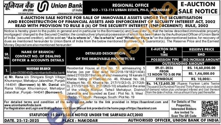 Residential House at Plot No. 10, admeasuring 5 Marias (as per Sale deed No.2018-19/182/1/404) dated 27/03/2019 share of land measuring 18 kanals 0 Marlas falling in Hadbast no. 46, Khewat No. 38, Khatauni No. 40, Khasra No. 217//1//2(3-0), 217/2(8-0), 217/3/19(6-10), 217//26(0-10) situated in the area of the village Riatpur, Tehsil Mehatpur, District Jalandhar and bounded as East: Plot No. 9, West: Plot No.11, North: Passage, South: Plot No. 19