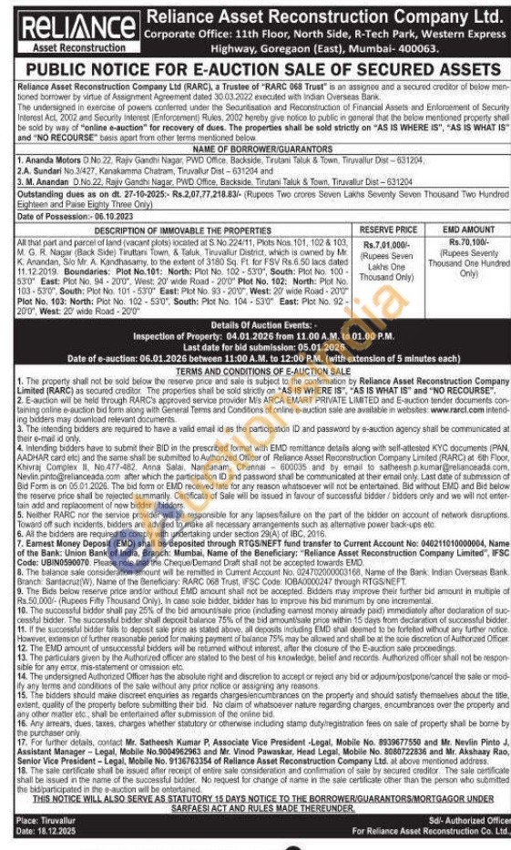 All that part and parcel of land (vacant plots) located at S No. 224/11, Plots Nos. 101, 102 & 103, MGR. Nagar (Back Side) Tiuttani Town & Taluk, Tiruvallur District, which is owned by Mr. K. Anandan, Sio Mr. A. Kandhasamy, to the extent of 3180 Sq. Ft for FSV Rs.6.50 lacs dated 11.12.2019. Boundaries: Plot No.101: North: Plot No. 102-530", South: Plot No. 100-530 East: Plot No. 94-200, West: 20' wide Road-2070 Plot No. 102: North: Plot No. 103-530", South: Plot No. 101-530 East: Plot No. 93-200", West: 27 wide Road-200 Plot No. 103: North: Plot No. 102-530, South: Plot No 104-530" East: Plot No. 92-200, West: 20 wide Road-200