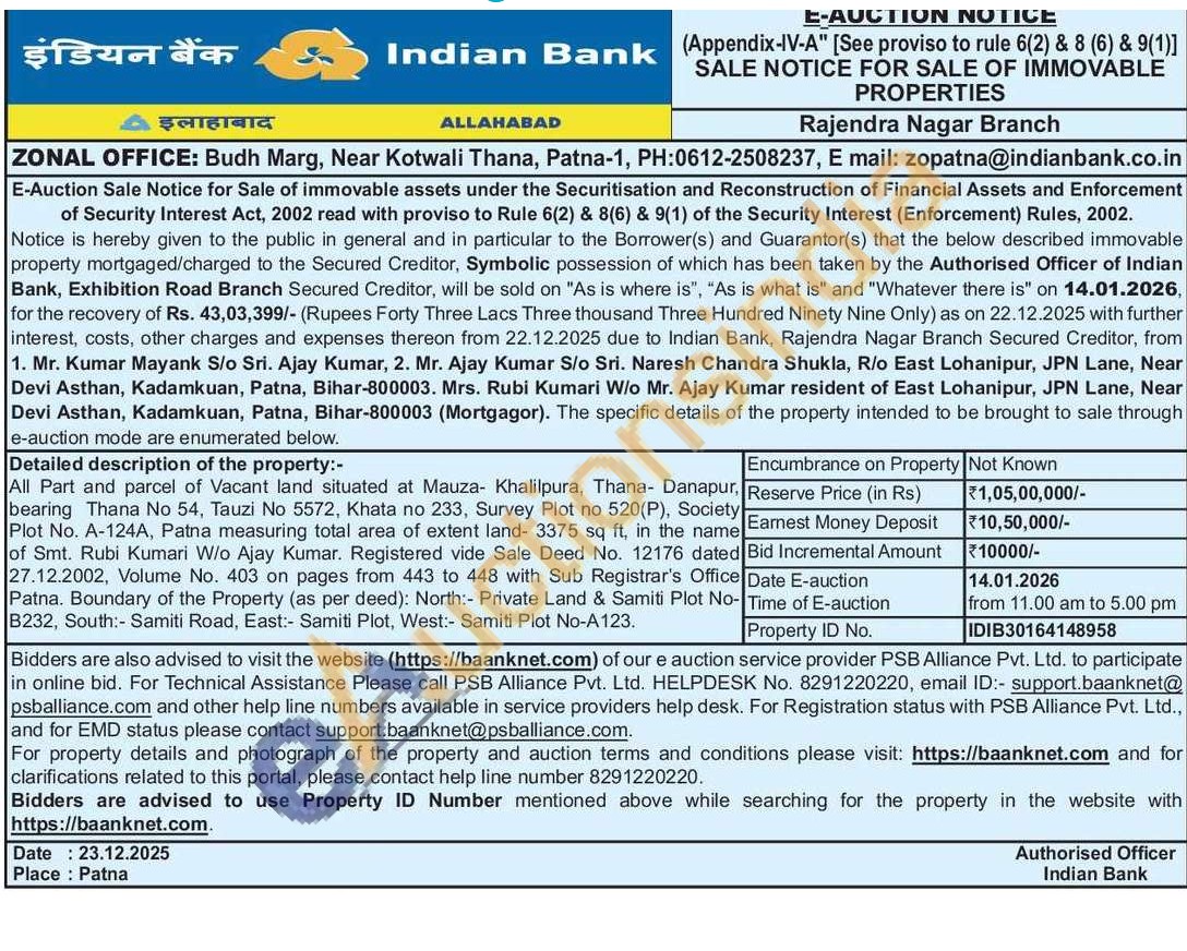 All Part and parcel of Vacant land situated at Mauza- Khalilpura, Thana- Danapur. bearing Thana No 54, Tauzi No 5572, Khata no 233, Survey Plot no 520(P), Society Plot No. A-124A, Patna measuring total area of extent land- 3375 sq ft, in the name of Smt. Rubi Kumari W/o Ajay Kumar. Registered vide Sale Deed No. 12176 dated 27.12.2002, Volume No. 403 on pages from 443 to 448 with Sub Registrar's Office Patna. Boundary of the Property (as per deed): North:- Private Land & Samiti Plot No-B232, South:- Samiti Road, East:- Samiti Plot, West:- Samiti Plot No-A123
