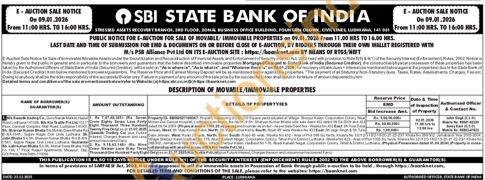 Property ID-SBIN0527100367: Property measuring (Plot)1600 Square yards situated at Village- Sherpur Kalan, Corporation Colony, Near Mohan Dai Cancer Hospital, Ludhiana standing in the name of Sh. Sharvan Kumar Bhatia vide sale deed 432 dated 09.04.2009 and 433 dated 09.04.2009. (Physical area is 1503.20 sq yards) and bounder as under:-As per Sale Deed No-Wasika No 432 East Sh Tulsi Dass Jetwani West: Sh Vijay Kumar Kalra, North: Sh Vijay Kumar Kalra, South: Road 45' wide Wasika No 433 East Sh Jagir Singh & Sh Tulsi Dass Jetwani, West Road 20 wide, North: Seller, South: Road 45' wide, Wasika No 432-Area of Plot 595 Sq Yards, Khasra No 32//1 2/3-18/2-19-20-21-22-23/1 Khata No 288/302, Jamabandi Year 2003-2004, Village Sherpur Kalan Hadbast No 176, Abadi Kailash Nagar, Corporation Colony. Tehsil Purvi District Ludhiana. Wasika No 433-Area of Plot1005 Sq Yards, Khasra No 32/1 2/3-18/2-19-20-21-22-23/1 Khata No me 288/302, Jamabandi Year 2003-2004, Village Sherpur Kalan, Hadbast No 176, Abadi Kailash Nagar, Corporation Colony. Tehsil & District Ludhiana, (Physical Possession dated 01.04.2024) (Property is cross-collateralize with an other account M/s Kia Textile Pvt Ltd.