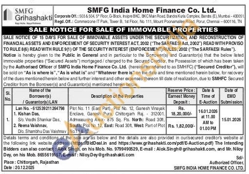 Plot No. 11 (East Part), Plot No. 12, Ganesh Vinayak Enclave, Ganesh Pura, Chittorgarh Raj. 312001. Admeasuring Area: 875 Sq. Fts. North: Road 30ft, South: Plot No. 12, East: Road 30ft, West Part of Plot No.11 & 12.