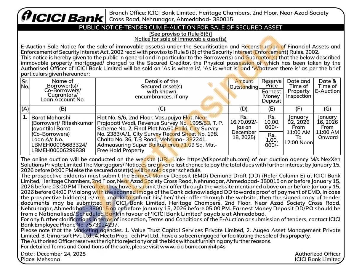 Flat No. S/6, 2nd Floor, Vasupujya Flat, Near Prajapati Wadi, Revenue Survey No. 1995/53, Τ. Ρ. Scheme No. 2, Final Plot No.60 Paiki, City Survey No. 2383/A/1, City Survey Record Sheet No. 198, Chalta No. 36, T.B Road, Mehsana-382241. Admeasuring Super Builtup area 71.09 Sq. Mtr.-Free Hold Property
