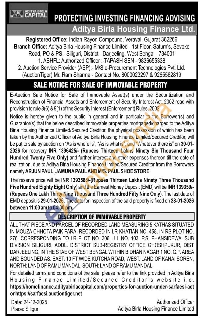 ALL THAT PIECE AND PARCEL OF RECORDED LAND MEASURING 5 KATHAS SITUATED IN MOUZA CHHOTA PAIK PARA, RECORDED IN LR KHATIAN NO. 458, IN RS PLOT NO. 276, CORRESPONDING TO LR PLOT NO. 306, J L NO. 103, P.S. PHANSIDEWA, SUB DIVISION SILIGURI, ADDL. DISTRICT SUB-REGISTRY OFFICE GHOSHPUKUR, DIST DARJEELING, IN THE STAE OF WEST BENGAL WITHIN BIDHAN NAGAR 1 NO. G.P. AREA AND BOUNDED AS: EAST: 10 FT WIDE KUTCHA ROAD, WEST: LAND OF KANAI SOREN, NORTH: LAND OF RAMU MANDAL, SOUTH: LAND OF RAMU MANDAL