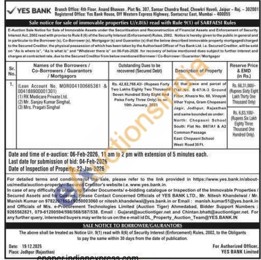 All that piece and parcet of Flat No. 8-67/A-3 Ground Finor, Khasra No. 60, Vinayak Vihar Yojna, Gram Chopasani Jagir, Jodhpur, Rajasthan and same trounded an under North: Chopasni School South: Flat. No. 867/A1 & A2 Common Passage East Chopaani School East Chopaani School