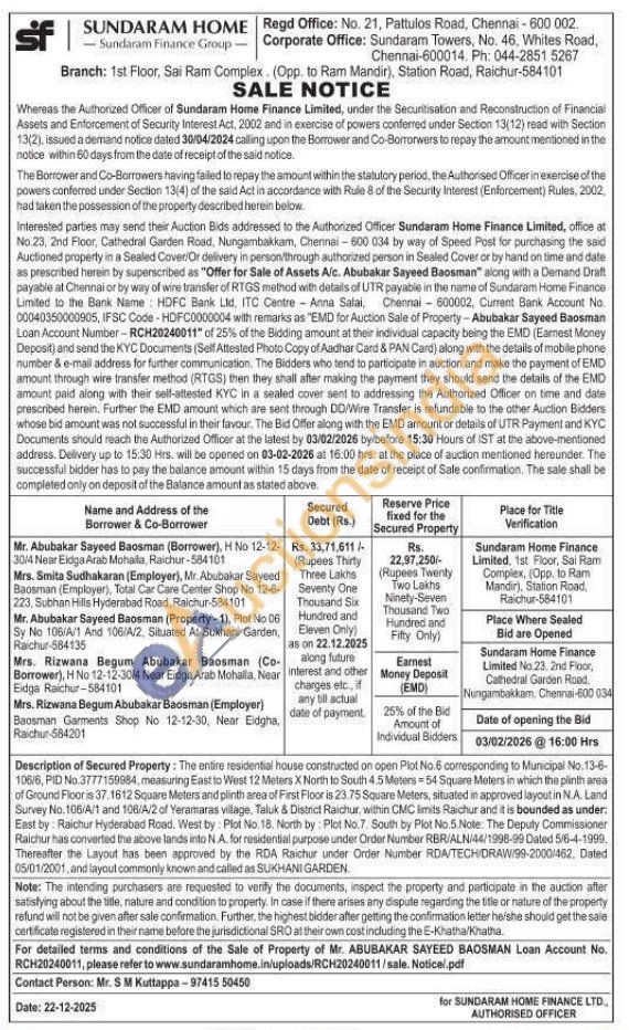 Description of Secured Property: The entire residential house constructed on open Plot No.6 corresponding to Municipal No. 13-6-106/6, PID No.3777159984, measuring East to West 12 Meters X North to South 4.5 Meters 54 Square Meters in which the plinth area of Ground Floor is 37, 1612 Square Meters and plinth area of First Floor is 23.75 Square Meters, situated in approved layout in N.A. Land Survey No. 106/A/1 and 108/A/2 of Yeramaras village, Taluk & District Raichur, within CMC limits Raichur and it is bounded as under: East by: Raichur Hyderabad Road. West by : Plot No. 18. North by: Plot No.7. South by Plot No.5.Note: The Deputy Commissioner Raichur has converted the above lands into N.A. for residential purpose under Order Number RBR/ALN/44/1998-99 Dated 5/6-4-1999. Thereafter the Layout has been approved by the RDA Raichur under Order Number RDA/TECH/DRAW/99-2000/462, Dated 05/01/2001, and layout commonly known and called as SUKHANI GARDEN